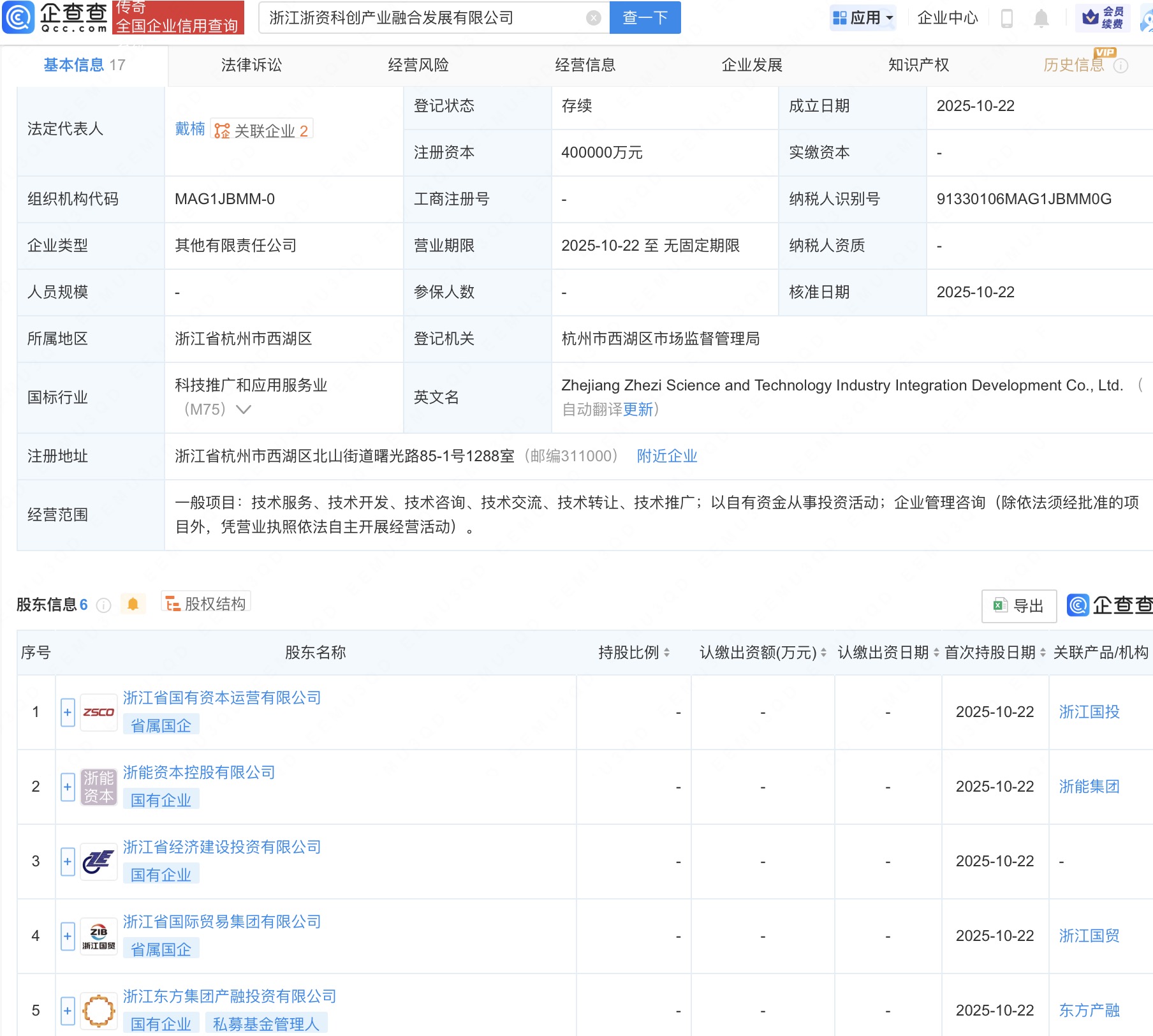近日,浙江浙资科创产业融合发展有限公司成立,法定代表人为戴楠,注册资本40亿人民币,经营范围为技术服务、技术开发、技术咨询、技术交流、技术转让、技术推广,以自有资金从事投资活动配资在线开户,企业管理咨询。企查查股权穿透显示,该公司由浙江省国有资本运营有限公司、浙能资本控股有限公司、浙江省经济建设投资有限公司、浙江省国际贸易集团有限公司等共同持股。